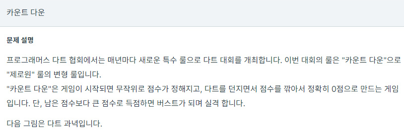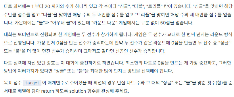 여기서 중요한 점은 횟수는 최소로 하되, 횟수가 같으면 싱글(1~20), 불(50)을 최대한 많이 맞혀야 한다.