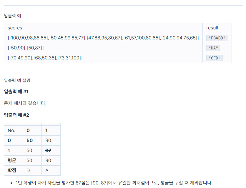 자기 점수가 유일한 최고점 또는 최저점이 아니면 sum에 자기 점수를 더하고 학생수만큼 나누어 avg에 저장한다.